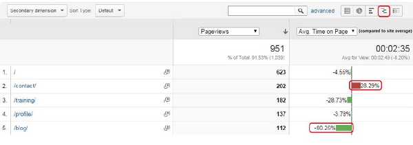 另外(wài)一(yī)個(gè)衡量頁面表現(xiàn)的(de)非常好(hǎo)的(de)方式是(shì)利用(yòng)“與網站(zhàn)平均數(shù)比較”的ε(de)選項。這(zhè)個(gè)圖會(huì)顯示某些(xiē)頁面在某個(gè)參數(shù)上(shàng)是(shì)不(bù)是(shì)在很(hěn)大(dà)程度®上(shàng)高(gāo)于或者低(dī)于平均值。雖然這(zhè)些(xiē)頁面仍然需要(yào)一(yī)頁一(yī)頁地∑(dì)分(fēn)析,因為(wèi)不(bù)同的(de)頁面有(yǒu)用(yòng)不(bù)同的(de)目标,但(dàn)是(shì)低(dī)于平均浏覽時(shí)間(jiān)的→(de)頁面總體(tǐ)來(lái)說(shuō)可(kě)能(néng)會(huì)有(yǒu)問(wèn)題,假設目标是(shì)為(wèi)了(le)>讓用(yòng)戶繼續閱讀(dú)的(de)話(huà)。下(xià)面的(de)例子(zǐ)清晰地(dì)表現(xiàn)出“聯系(contact)&r♠dquo;頁面相(xiàng)對(duì)來(lái)說(shuō)有(yǒu)比平均值更低(dī)的(de)浏覽時(shí)間(jiān),然而“博客(blog)&r↑dquo;頁面有(yǒu)高(gāo)于平均值80%的(de)時(shí)間(jiān)。